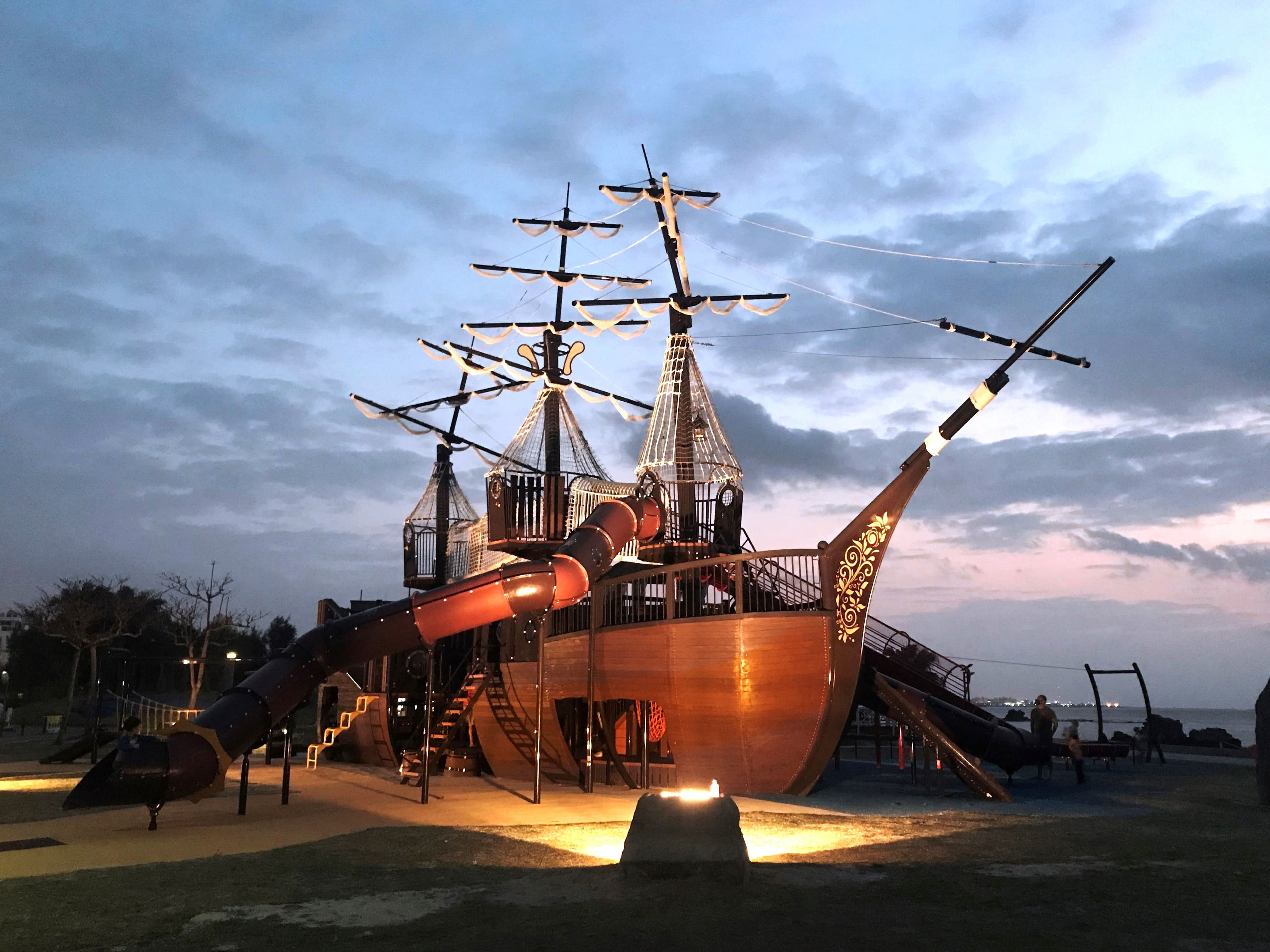 大型の船型遊具(インディアンオーク号)が人気の安良波公園と併設された横長のビーチ。遊具で、海で、思いっきり遊べます。BBQもあります!